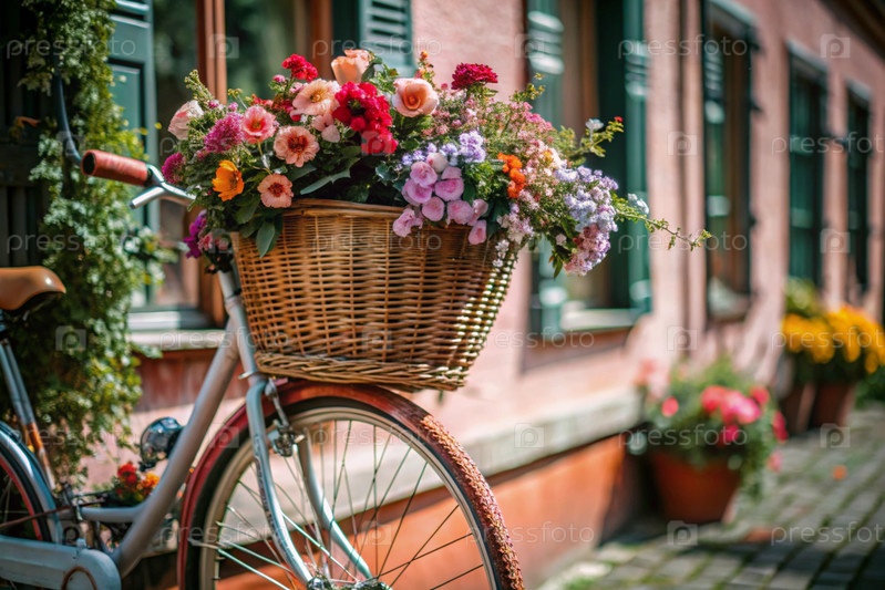 Красивый ретро-велосипед с цветами в корзине стоит за пределами летнего дома.Лето наступило.Городской транспорт