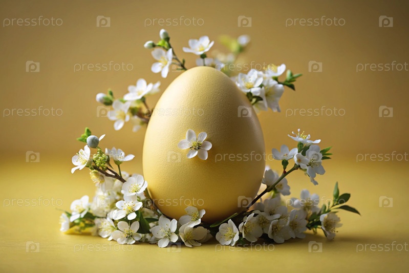 Концепция яркого пасхального праздника минималистична. Пасхальное желтое яйцо с нежными белыми вишневыми цветами на тонком жёлтом фоне