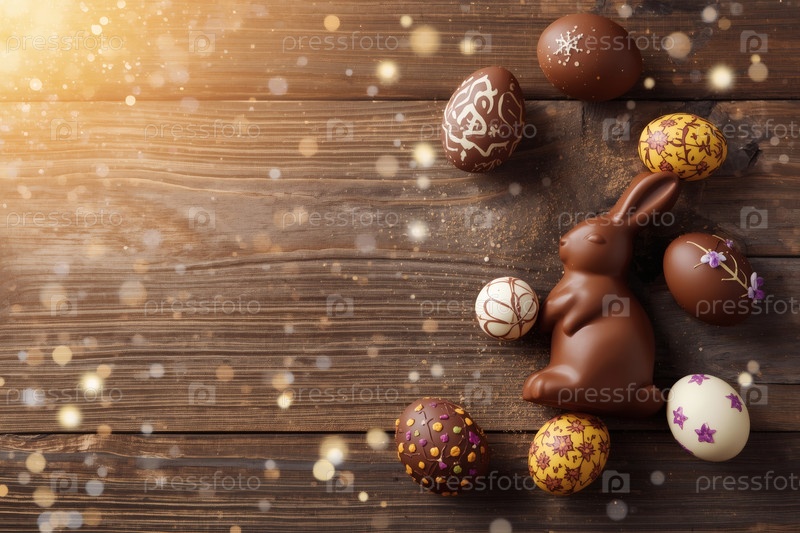 Концепция ярких пасхальных праздников в 2026 году. Красивая открытка. Баннер. Шоколадные пасхальные яйца и шоколадное зайцо на деревянном фоне. Пасхальные сладости и лакомства