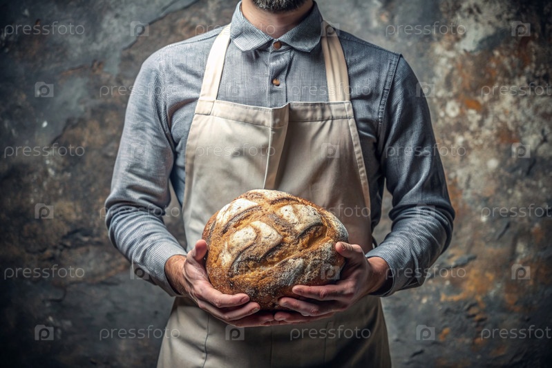 Свежий вкусный хлеб в руках пекаря-мужчины на близком расстоянии. свежевыпеченный кислый хлеб с золотой корой. пекарня со вкусным хлебом. кондитерские изделия
