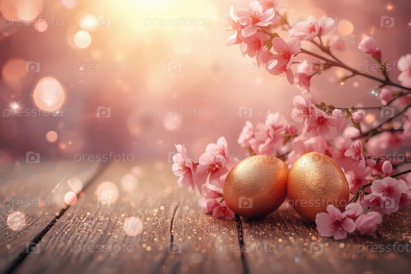 Концепция яркого пасхального праздника в 2026 году.Нежные розовые пасхальные яйца и вишневые ветви на деревянном фоне