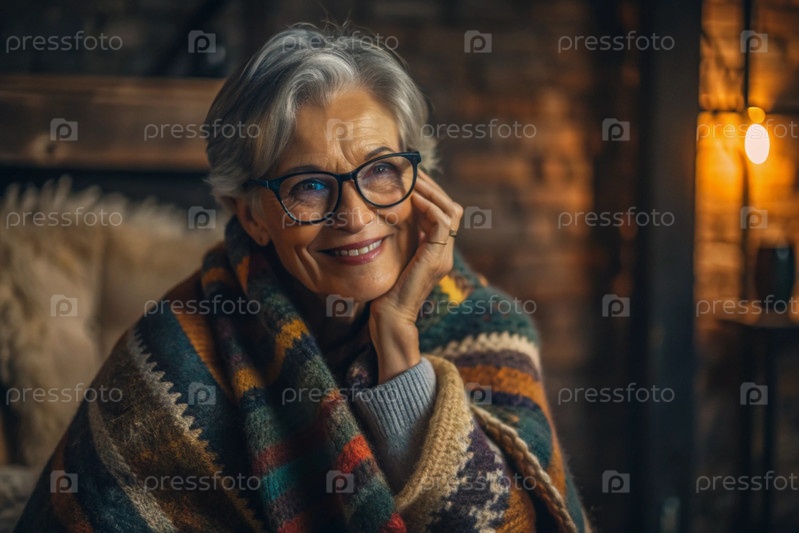 Осенний портрет красивой пожилой женщины, пенсионерки 70 лет. Он завернут в теплую клетку с этническим рисунком. Концепция жизни пожилых людей