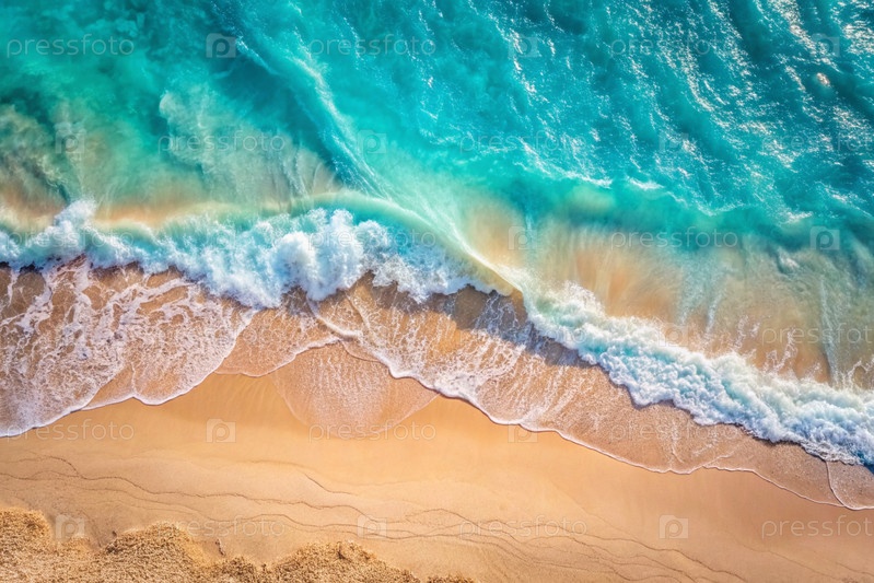 Концепция отдыха и путешествий. Красивый фон. Вид сверху на белый песчаный пляж и пенообразная волна бирюзового океана