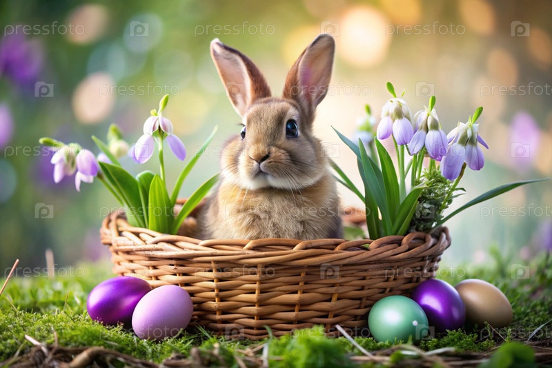 Баннер. пасхальный кролик в корзине из красочных пасхальных яиц вокруг весенних снегопадов и первичной розы. концепция праздника Пасхи