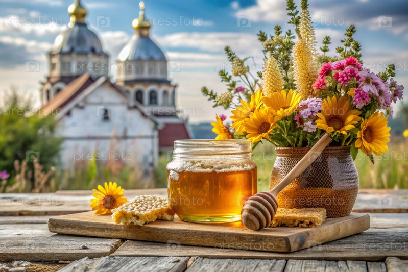 Концепция российского православного праздника 'Мёд Спаситель'.Стеклянная кружка с медом, сосны и букет диких цветов на фоне Православной церкви
