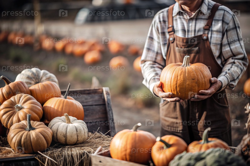 Руки мужчины в квадратной рубашке с тыквенным крупным планом и красивым осенним рисунком. Сбор тыков. Концепция празднования Дня благодарения и Хэллоуина