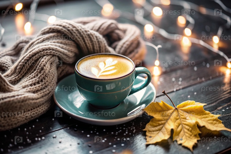 Сладкое горячее капучино в кружке с тарелкой и вязанной канавкой, шарф на деревянном столе внутри кафе. дождливый осенний день
