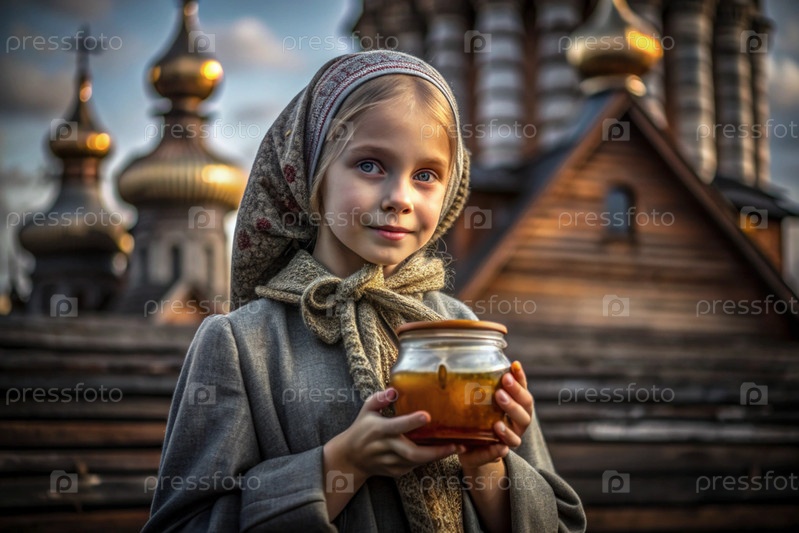 Концепция российского православного праздника 'Мед Спаситель' - красивая маленькая девочка в русской национальной одежде и шарф с баночкой меда на фоне православной церкви