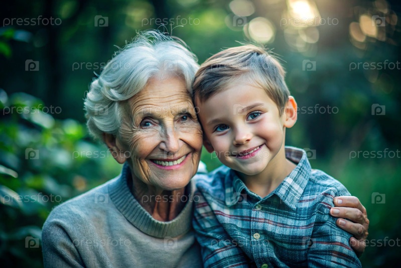 Счастливая семья, ребенок и бабушка обнимаются на улице в парке, счастливы и довольны