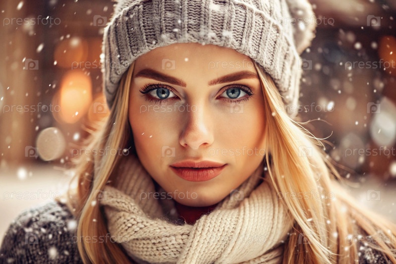 Зимний портрет: блондинка с ярко выраженными голубыми глазами в вязанной шляпе, шарфе и свитере