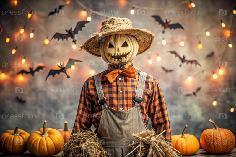 Концепция Хэллоуина. Ужасная. Страх. Устрашающий богий с тыквенной головой, квадратной рубашкой и бабочкой. Баннер, открытка