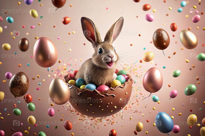 Известный праздник. милый пасхальный кролик заглядывает из ямы с красочными яйцами вокруг. концепция счастливой Пасхи