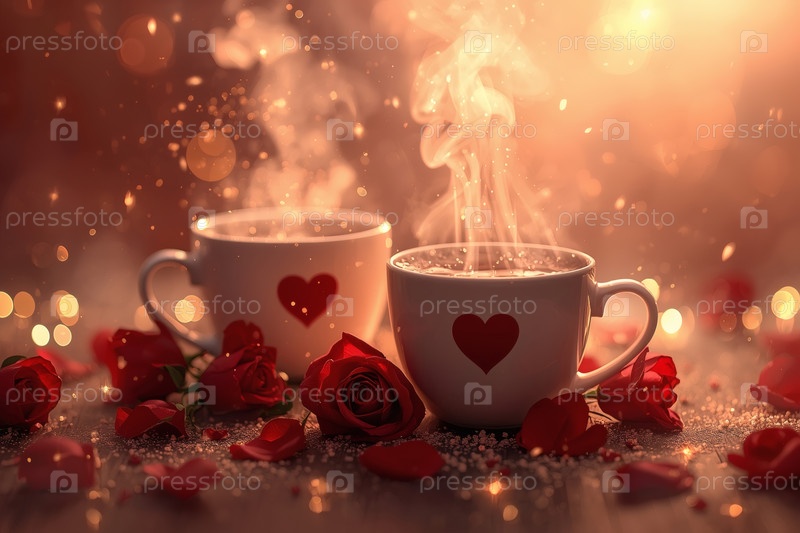 Чашки горячего кофе или чая, окруженные красными цветами и сердцами в День святого Валентина