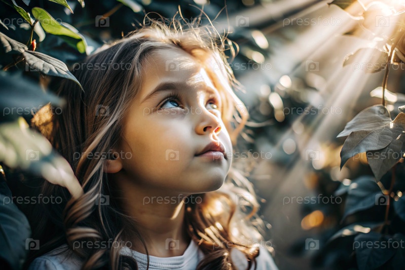 Красивый весенний портрет маленькой блондинки с кудрявыми волосами в лучах солнечного света природы