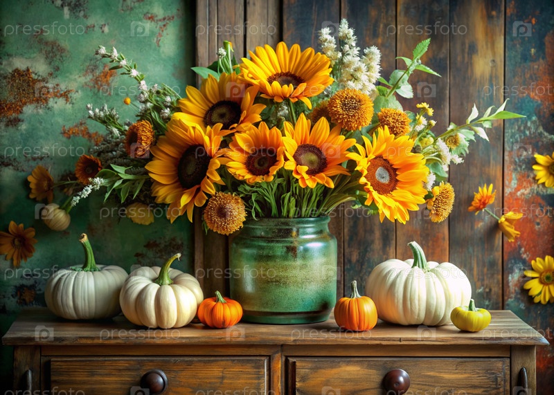 Красивый осенний букет желтых подсолнечников и пшеницы в вазе и декоративные тыквы на древнем деревянном шкафу. Букет цветов в вазе во внутренней части дома. Желтый, зеленый цветочный фон