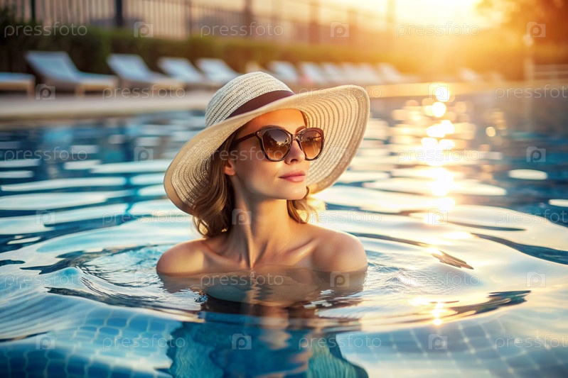 Красивая молодая женщина в шляпе и солнцезащитных очках плавает и тренируется в отопительном бассейне, счастливая и улыбающаяся девушка