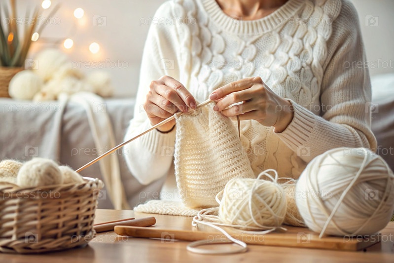 Женщина с пряными шарами вяжет теплый свитер в белых и бежевых тонах в своих руках. Игла, трикотаж. Зимний сезон, малый бизнес, ручная одежда
