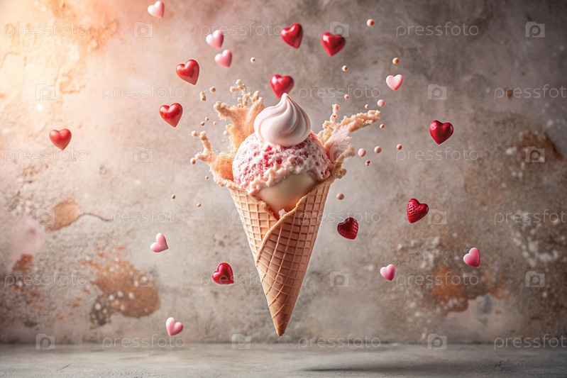 Сладкий десерт. Любовь к мороженому. Сердечно-образный конус мороженого с брызгами, сердцами и пятнами. Концепция Дня святого Валентина. Баннер, реклама