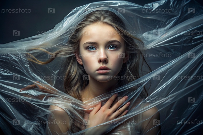 Девочка завернута в целлофан или сумку. Девушка задыхается. Пластиковое загрязнение планеты. Опасность для окружающей среды. Сокращение повторного использования пластика. Переработка. Концепция мусора