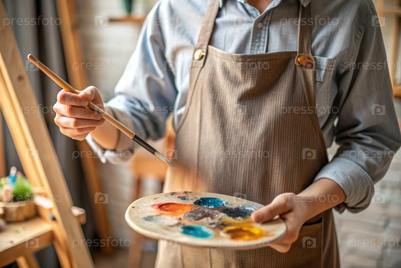 Близко. Понятие творческой деятельности. Художник в мастерской с маслом и кистью в руках. Искусство, креативность и отдых