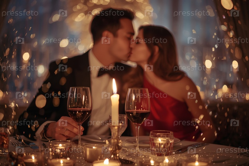 Концепция Дня святого Валентина: элегантная пара, целующаяся на романтическом ужине при свечах с бокалами вина в роскошный вечер