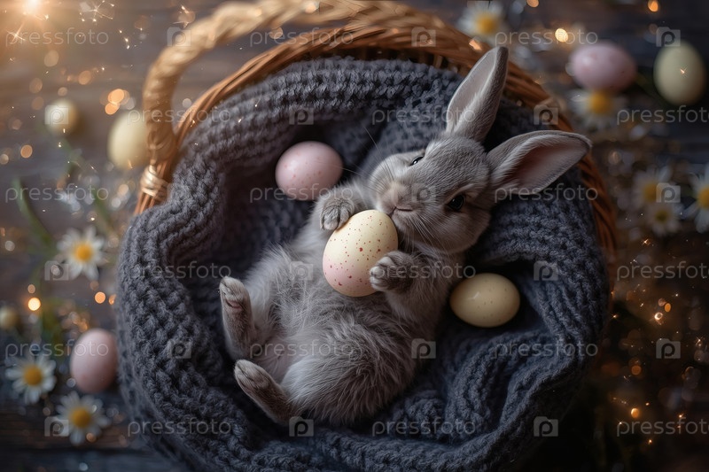 Пасхальный кролик держит пасхальное яйцо в лапах, лежит на спине на сером вязанном одеяле и смотрит в камеру