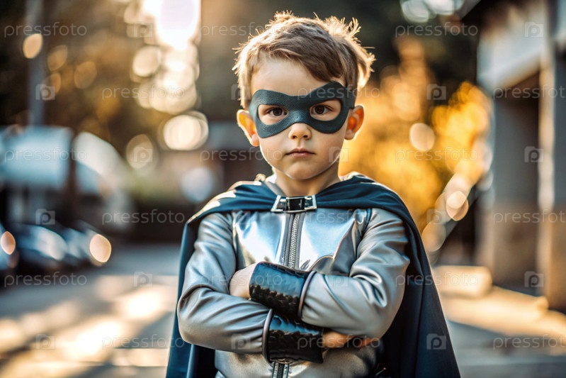 Маленький мальчик в костюме супергероя на улице ребенок со сверхспособностями герой костюмированная вечеринка