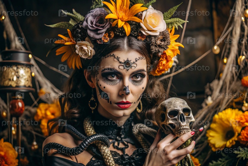 Концепция Хэллоуина. Ужасно. Костюмированная вечеринка. Красивая женщина с покрашенным черепом на лице и цветами на голове. Баннер, открытка