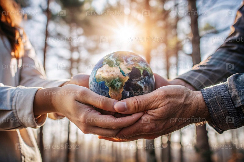 Мужчины и женщины держат маленькую модель Земли. Возрождение. Забота о планете, экологическое сознание и единство людей в сохранении природы