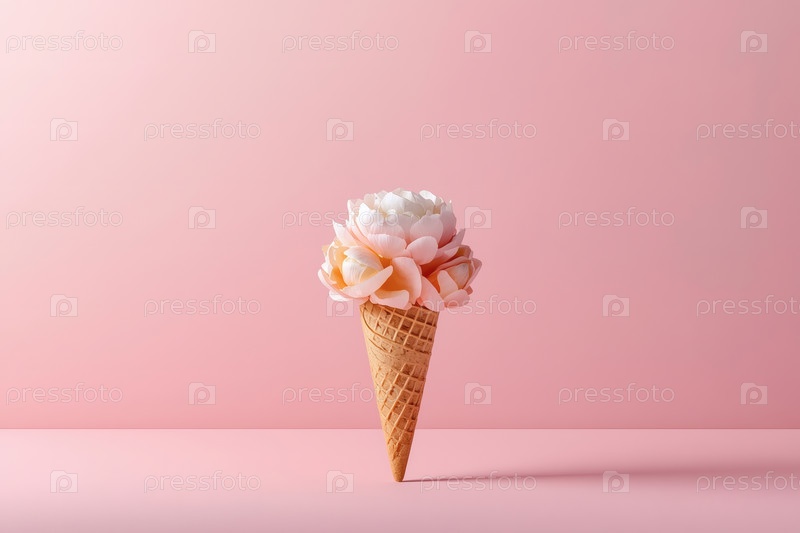Минимальная студийная фотография. Вафельный конус. Наполненный тонкими пастельными цветами, напоминающими пионы или розы, с многослойными лепестками в мягких розовых и персиковых оттенках на розовом фоне
