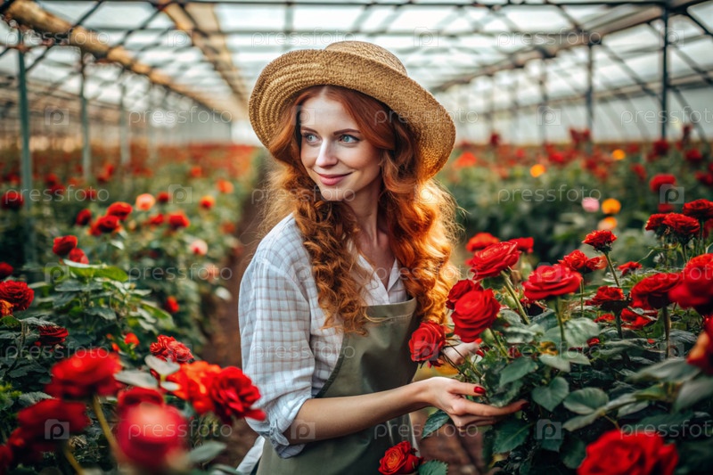 Портрет красивого садовника с рыжими волосами в соломенной шляпе, работающего с розами в стеклянной теплице