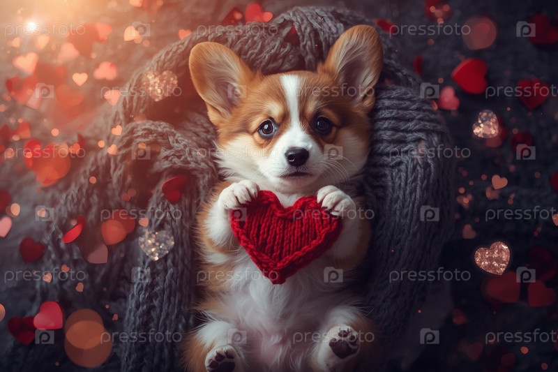 Концепция Дня святого Валентина. красное вязаное сердце в лапах щенка коргиса. открытка с бело-красной собакой, лежащей на вязанном одеяле