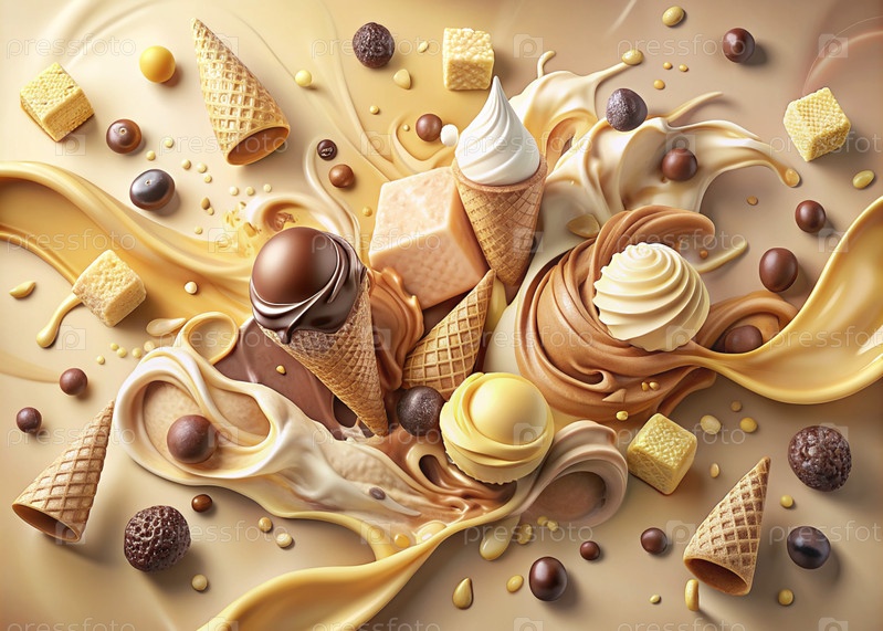 Абстрактная композиция с таяющим мороженым. Плески и брызги мороженого. натюрморт с перевернутым конусом мороженого на бежевом фоне