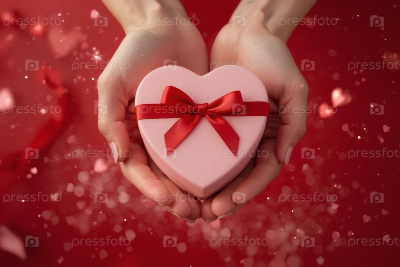 Руки женщины, держащей подарок в форме сердца с красной лукой на День святого Валентина