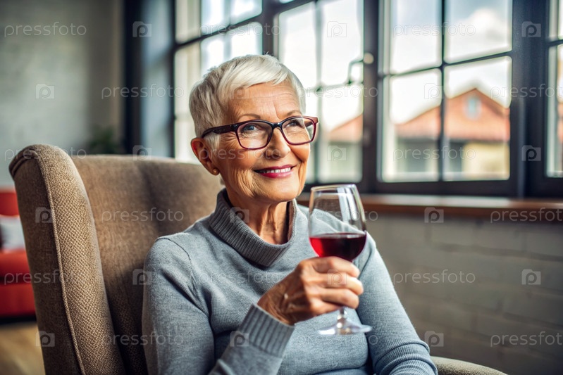 Современная, стильная пожилая женщина с короткими волосами со стаканом красного вина на стуле в гостиной дома