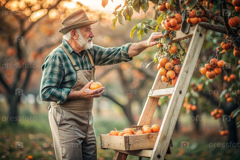 Сельскохозяйственная промышленность. Деревянный ящик с персимом в руках фермера-мужчины. Садовник собирает богатый урожай. Ближе, солнечный свет. Осенний плодовый сбор