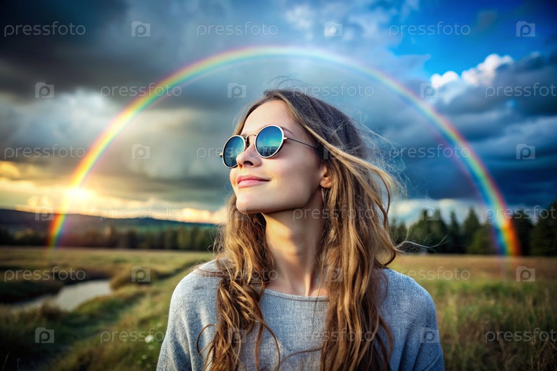 Счастливая женщина-хиппи в круглых солнцезащитных очках на фоне радуги.Девушка занимается медитацией и глубоким дыханием