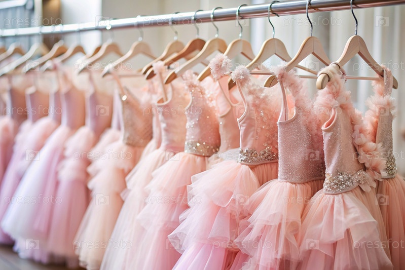 Детские вечерние пушистые светло-розовые платья висят с белых вешалок на палочке в салоне