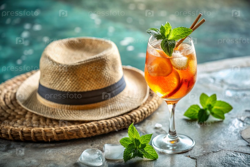 Стакан вкусного апельсинового коктейля Aperol на фоне бассейна.Алкогольный коктейль сочных фруктов с апельсином, кубиками льда и мятой