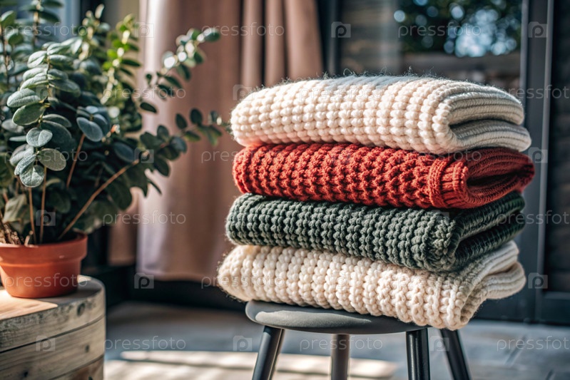 Близко, вяжу тёплую одежду на деревянном стуле в комнате.Зимний сезон, малый бизнес, ручная одежда