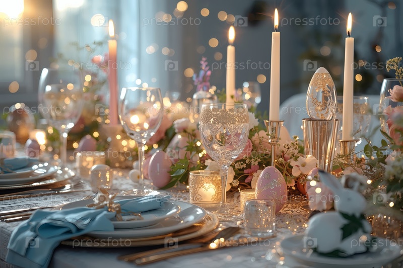 Пасхальный баннер 2026. декоративная тарелка, столовая посуда, стаканы, пасхальные яйца и кролики. концепция празднования Пасхи для кафе и ресторанов