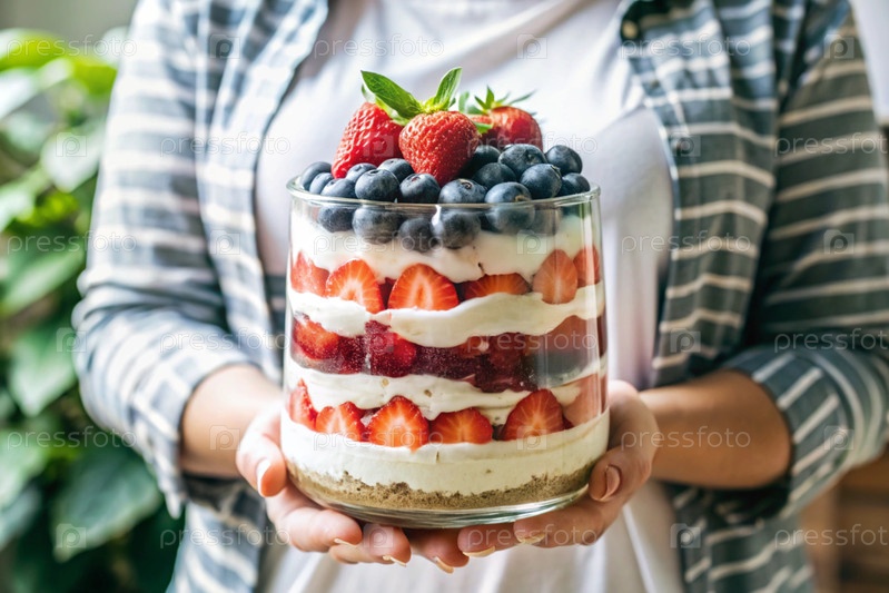 Концепция праздничных блюд. Красивый и вкусный десерт в руках женщины. Торт со свежими клубниками и черники. Лекарства и сладости