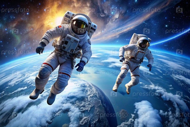 Счастливый День космоса.Астронавты в скафандрах.Впечатляющий вид на планету Земля