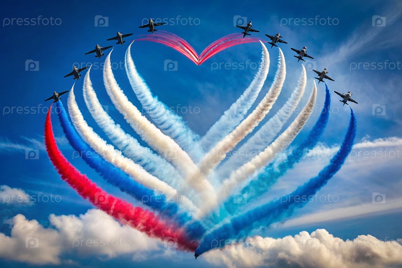 Концепция празднования Дня России 12 июня.Военные самолеты рисуют сердце в цвета российского триколорного дыма на небе.Белый, синий, красный дым