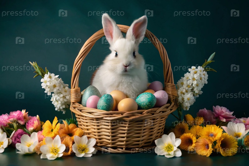 Баннер. пасхальный кролик в плетеновой корзине, наполненной красочными пасхальными яйцами. концепция весенних праздников Пасхи