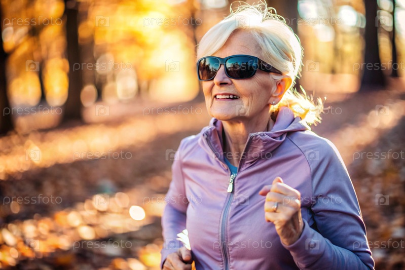 Пожилая женщина бегает по утрам в осеннем парке, счастливый и улыбающийся пенсионер
