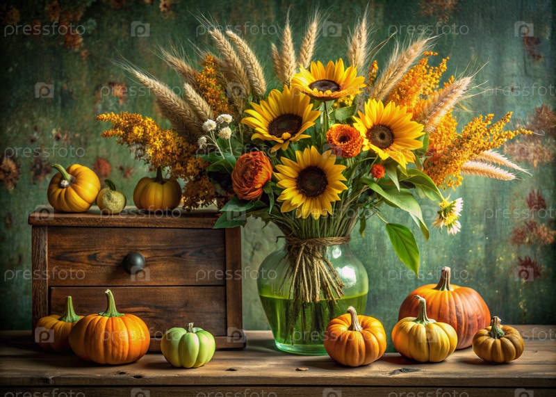 Красивый осенний букет желтых подсолнечников и пшеницы в вазе и декоративные тыквы на древнем деревянном шкафу. Букет цветов в вазе во внутренней части дома. Желтый, зеленый цветочный фон