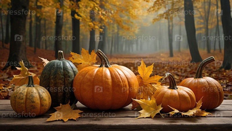 Осенний фон тыквы и осенние листья на фоне леса. Концепция Хэллоуина