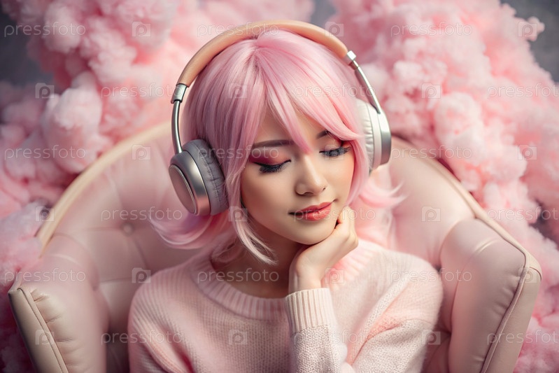 Молодая красивая японская девушка с розовыми волосами в аниме слушает музыку на беспроводных наушниках в розовых облаках