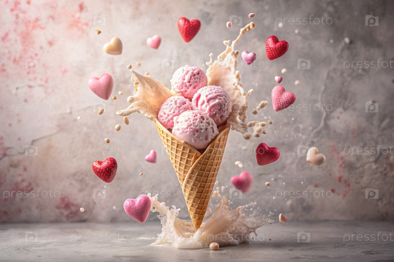 Сладкий десерт. Любовь к мороженому. Сердечно-образный конус мороженого с брызгами, сердцами и пятнами. Концепция Дня святого Валентина. Баннер, реклама